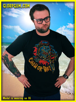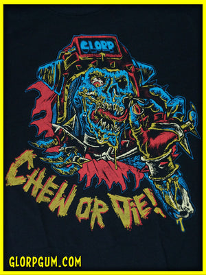 Chew or Die: the anthem of the disillusioned GLORP Gum youth of the eighties. Rip the world a new one with this RAD shirt!