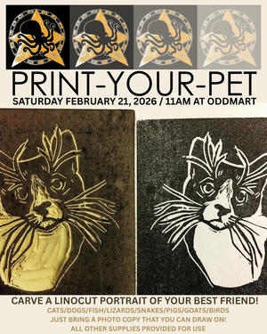 Bring a photocopy/printed out image of your pet (something you can draw on) and we’ll use it to create a carved stamp that you can keep and use over and over again! Participants receive a carving block that is about 4x5 inches in size, so the source photo should not be bigger than that. You can cut your block in half if you want to and carve two different pet portraits! (Just be sure you bring smaller images to work from if you want to do that, about 2x2 ½ inches, kind of wallet size) OR maybe you want to include your pet’s name in your design! The options are endless!