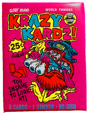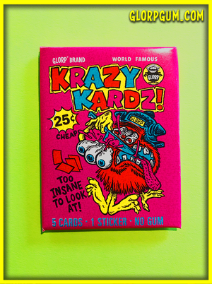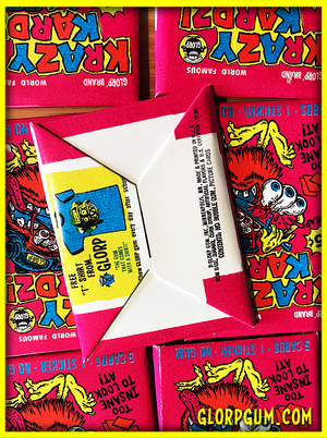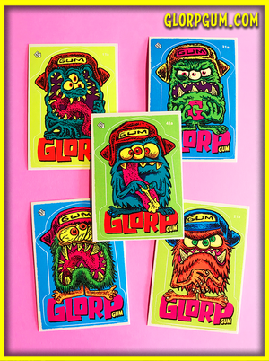 Every package has a random assortment of 5 GLORP trading cards! You might get some GLORP Valentines, Gross Guts Gang cards, a Troll jams card, Some Santa Strikes Cards, or some out of print GLORPOID Destroys cards!