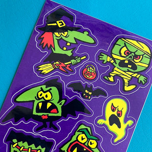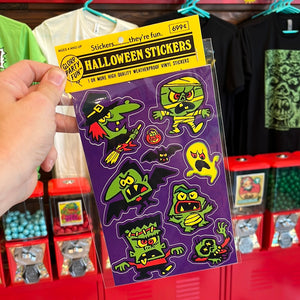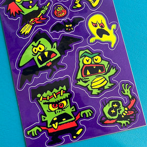 These "big ol’" 5”X8.5” Halloween sticker sheets contain 9 high quality weatherproof vinyl stickers. Perfect for mugs, cars, water bottles, helmets, rifles, fallout bunkers, hand grenades, murder drones, self driving chainsaws, and lunchboxes!