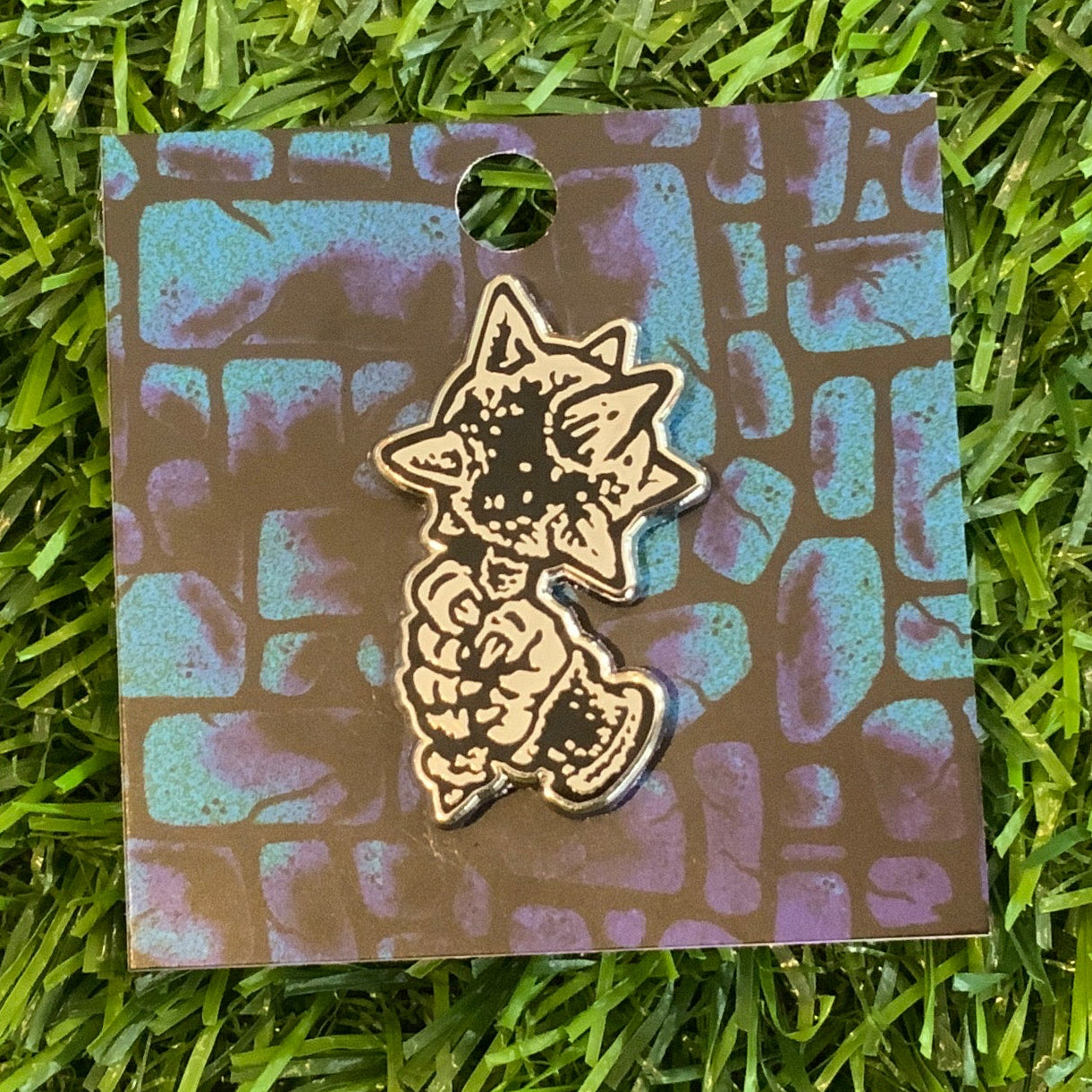 1” tall hard enamel black dye-plated lapel pin with 2 clutch post with rubber backers.