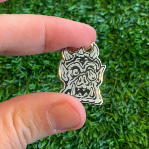 1” tall hard enamel black dye-plated lapel pin with 1 clutch post with a rubber backer.